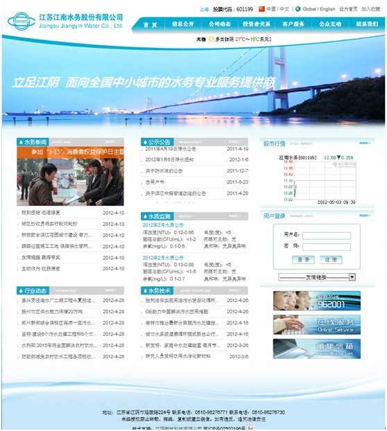 在欄目設置和內(nèi)容上,進行了重新組合,新網(wǎng)站保留了原網(wǎng)站的信息公開、公司動態(tài)和客戶服務模塊;行業(yè)動態(tài)和水務技術繼續(xù)沿用水網(wǎng)的接口,使網(wǎng)站具有最新的水務資訊。首頁新增了股市行情模塊,實時的展現(xiàn)公司股票(證券代碼:601199)的最新行情;新增了“投資者關系”欄目,及時準確地為投資者提供投資信息。同時針對客戶日益增長的網(wǎng)上服務需求,新網(wǎng)站更新了水費查詢系統(tǒng),該系統(tǒng)與公司營銷系統(tǒng)對接,準確實時地為客戶提供用水清單和用水趨勢圖。并與公司的服務熱線962001實現(xiàn)無縫對接,及時處理客戶的投訴、咨詢與報漏報修等。網(wǎng)站還開設了公眾互動功能,讓客戶更好地了解水、了解水公司。