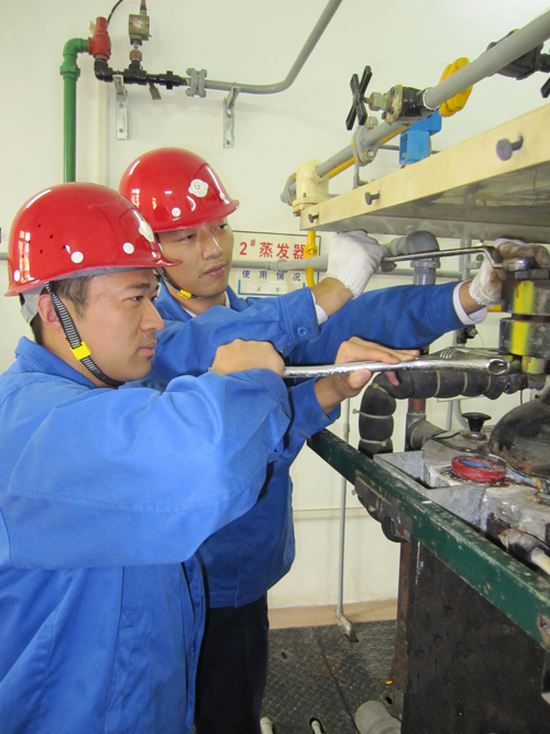 作為重大危險源危險設(shè)備整體檢修保養(yǎng)工作的一部分,該水廠在去年底就對蒸發(fā)器的保養(yǎng)制定了詳細的計劃,一方面通過設(shè)備部聯(lián)系設(shè)備供應(yīng)商進行技術(shù)指導、組織備品備件,另一方面協(xié)調(diào)機電維修中心及早落實人員和檢修時間、謀劃好檢修時的生產(chǎn)調(diào)度工作。在檢修過程中,檢修人員按照相關(guān)步驟和要求,嚴謹有序展開維護保養(yǎng),把蒸發(fā)器的各個部件及附屬管線一一拆卸,清洗、干燥蒸發(fā)筒內(nèi)壁,清除加熱水箱積垢,疏通加氯管線和過濾器,更換陽極保護鎂棒,修理故障零部件……仔細排查,有效消除設(shè)備隱患。當天,各部門相互配合、緊密協(xié)作,從早上一直奮戰(zhàn)到晚上六點多鐘,圓滿完成了蒸發(fā)器的保養(yǎng)任務(wù)。