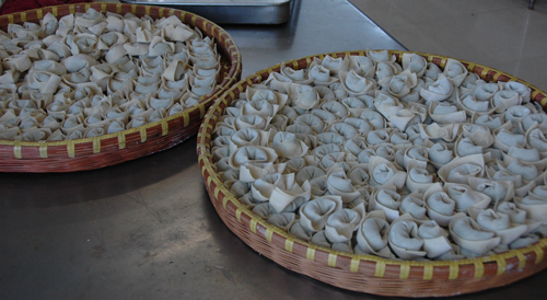 在其他員工的帶動(dòng)下,新員工包得很認(rèn)真,包起餛飩來(lái)可是相當(dāng)?shù)檬旖j(luò),短短幾秒鐘,一張一合,漂亮的餛飩就誕生了。