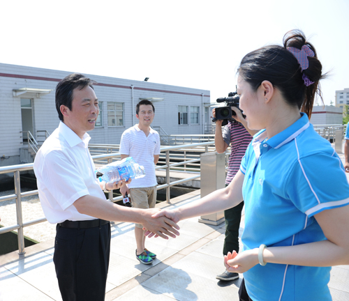 蔣書記一行走訪視察了平流沉淀池、V型濾池等自來水生產運行環節,與正在V型濾池上進行沖洗作業的工作人員一一親切握手,向他們送上了礦泉水、毛巾等消暑用品,并要求供水部門嚴陣以待,排查安全隱患,采取有針對性的措施,繼續提高供水質量,保障供水安全,確保萬無一失,不斷提高市民滿意度。