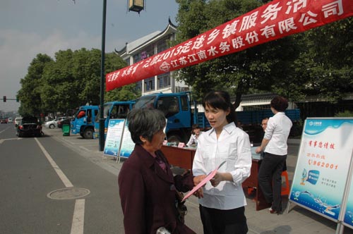 10月22、24日,公司客服中心、質量管理部、馬鎮營業所、峭岐營業所等部門人員,分別在馬鎮、峭岐開展“江南夢.水務情”2013走進鄉鎮服務活動。活動現場,工作人員向用戶大力宣傳安全用水、節約用水知識,普及冬季供水設施防凍保暖小常識,介紹了962001微信公眾服務平臺的功能,并就水質、水費等事項提供咨詢服務,受到了廣大用戶的普遍歡迎。