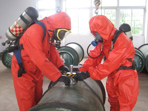 搶險人員迅速行動,穿好防護服,戴上防毒面具,熟練利用氨水尋找漏點,將壓罩罩在泄漏的針閥上,用動夾頭固定氯瓶保護圈……旋緊螺桿,壓緊壓罩,確保液氯處于密閉狀態,搶險人員各司其職、緊張有序。 15分鐘后,液氯泄漏應急處置完畢,演練順利結束。
