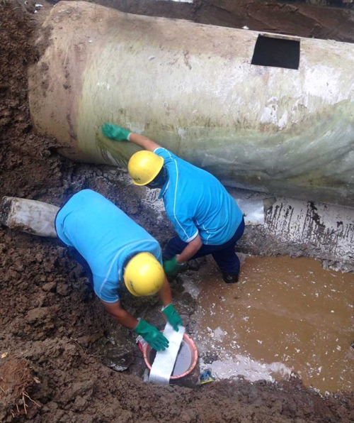 按照“盡快修復,影響范圍最小”的要求,搶修人員先用挖掘機開挖至漏水點附近,再采取人工開挖的辦法搶修漏水部位。為提速施工進度,爭取最短時間恢復通水,現場人員不顧疲勞,站進齊膝深的泥漿中,爭分奪秒,輪流作業,硬是用鐵鍬在管道下方掏出一個修補管道破裂處的作業空間。清洗、切割、打磨、敷玻璃纖維布……搶修工作有條不紊地進行。經過近23個小時的持續奮戰,終于在次日凌晨2點30分恢復正常供水,比預計時間整整提前了3個小時。