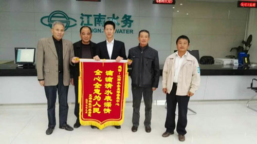 “滴滴清水表深情,全心全意為人民。”10月14日,臨港街道夏港社區(qū)六組的幾位村民代表來到夏港客服中心,以一面小小錦旗表達對江南水務的濃濃感激之情。