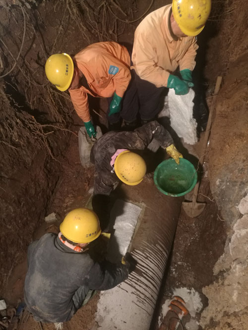 險情就是命令。搶修班組當即使用電錘鑿開混凝土,發現玻璃鋼管出現縱向裂縫,如不盡快修復,隨時都有爆管的可能,局面將會進一步惡化。時間緊迫,搶修隊爭分奪秒搶進度,班長帶頭跳入水中,進入管溝作業。
