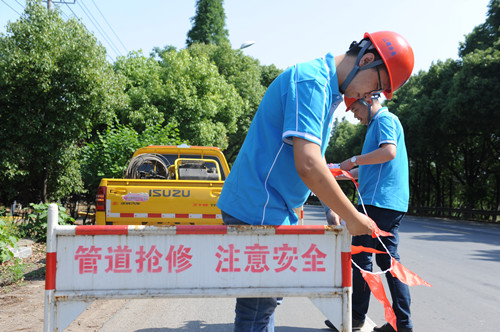 5月26日14點18分,市政工程公司搶修隊接到用戶的緊急電話:位于云顧路柳工道路機械有限公司附近綠化帶內(nèi)發(fā)生爆管。險情就是命令。搶修隊接報后快速反應(yīng),迅速組織人員、車輛、設(shè)備趕赴現(xiàn)場。14點45分,搶修隊隊長孫燕春、搶修一班和搶修四班相繼來到事發(fā)地點,勘察現(xiàn)場具體情況,初步確認是路東側(cè)綠化帶內(nèi)DN1000水泥管爆管,由于爆漏情況較為嚴重,估計將會造成該區(qū)大面積停水,結(jié)合現(xiàn)場情況,搶修人員一邊在爆管現(xiàn)場周邊進行安全圍擋,一邊迅速進行關(guān)閥止水,同時著手對外發(fā)布停水信息,并準備向停水區(qū)域送水,搶修工作緊張有序地進行。